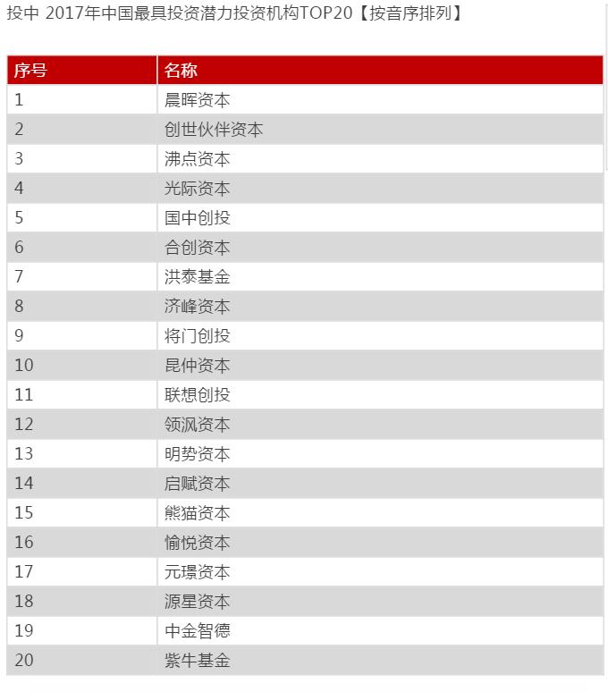 合創(chuàng)資本入選“中國最具投資潛力投資機構(gòu)”榜單 2017-09-25 “投中2017有限合伙人榜單暨中國核心競爭力”榜單于9月25日正式發(fā)布。作為國內(nèi)以技術(shù)投資實力著稱的專業(yè)投資機構(gòu)之一,合創(chuàng)資本入選“2017年中國最具投資潛力投資機構(gòu)TOP20”。