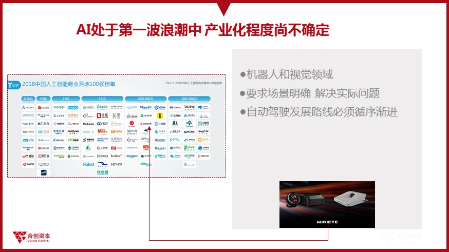 當(dāng)談到近期火熱的人工智能時(shí),合創(chuàng)資本創(chuàng)始人丁明峰表現(xiàn)得十分理性:“AI還處于初級(jí)階段,產(chǎn)業(yè)化程度尚不確定,因?yàn)锳I目前的感知能力非常有限,還無法形成有效的邏輯判斷。當(dāng)前AI只有在非常明確的應(yīng)用場景下才能產(chǎn)生商業(yè)價(jià)值,我們投資MINIEYE就是出于這個(gè)原因?!?br />