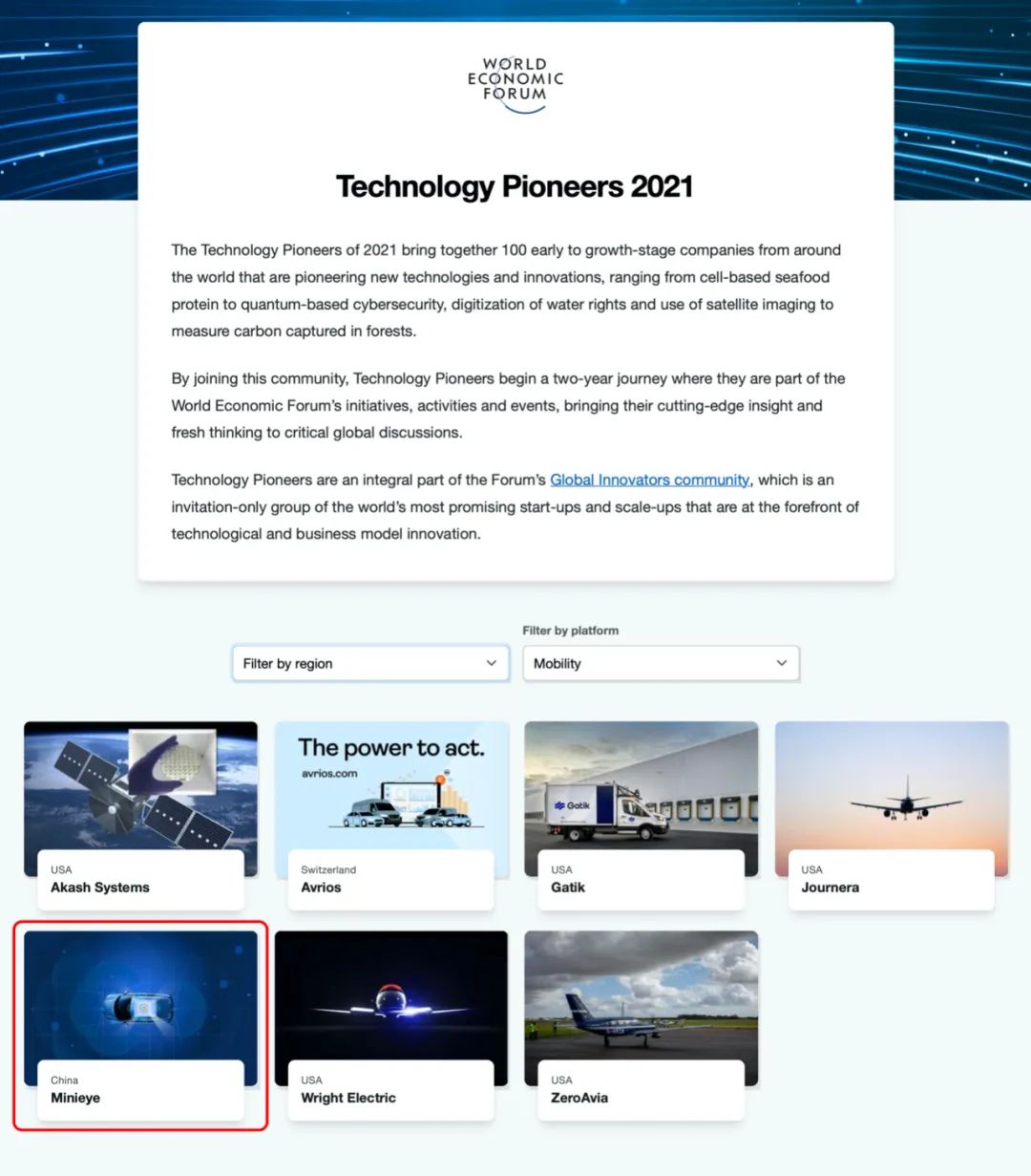 美國當(dāng)?shù)貢r(shí)間2021年6月15日,世界經(jīng)濟(jì)論壇(又稱“達(dá)沃斯論壇”)發(fā)布了2021年度技術(shù)先鋒榜單,從全球范圍內(nèi)選出了100家新興科技企業(yè)。專注于自動(dòng)駕駛技術(shù)研發(fā)的MINIEYE(深圳佑駕創(chuàng)新科技有限公司)成為8家獲選的中國企業(yè)之一。