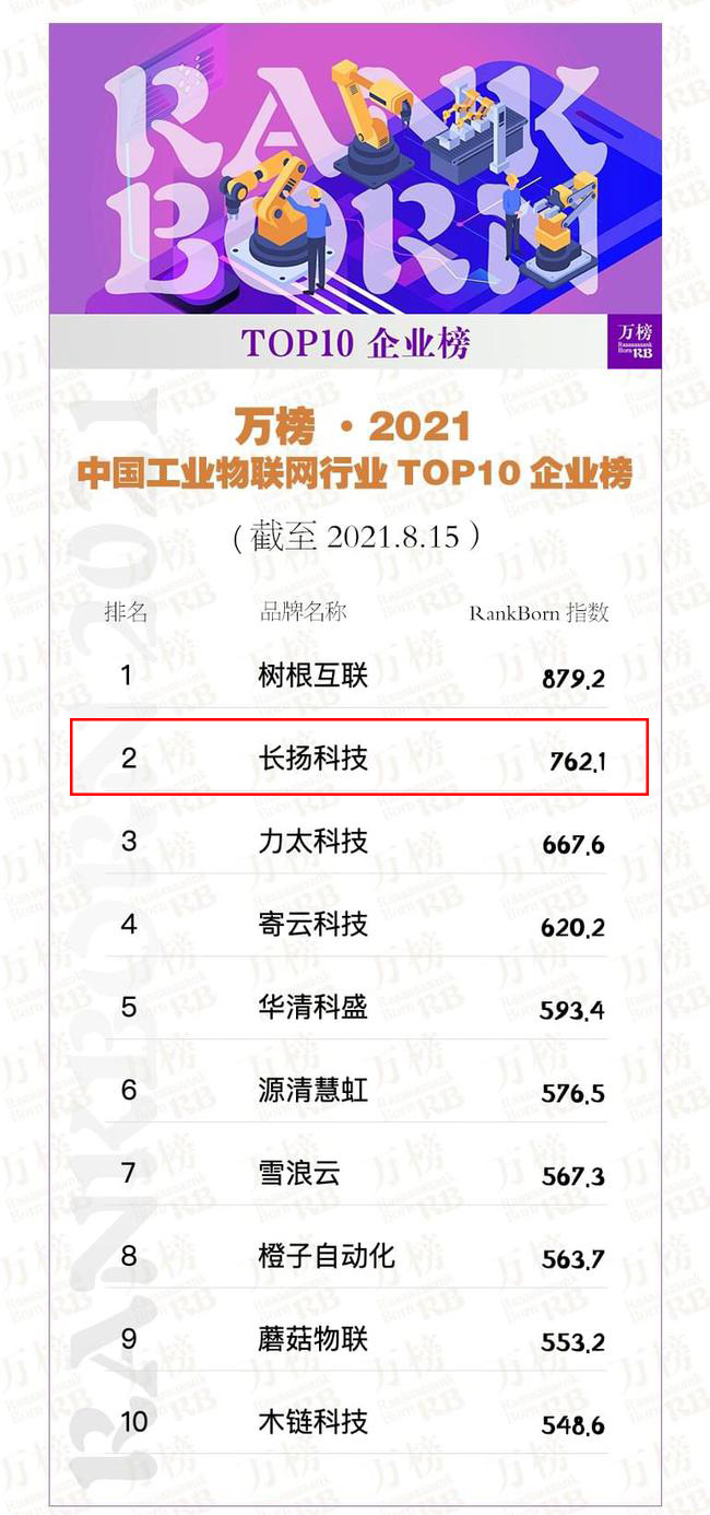 8月19日,萬(wàn)榜發(fā)布“2021中國(guó)工業(yè)物聯(lián)網(wǎng)行業(yè)TOP10企業(yè)榜”,長(zhǎng)揚(yáng)科技憑借專(zhuān)利情況、融資規(guī)模等多個(gè)維度的領(lǐng)先優(yōu)勢(shì),綜合實(shí)力位居第二。