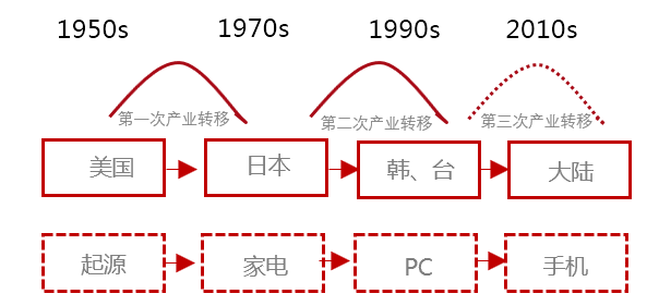 其次,我們?cè)倏纯慈虬雽?dǎo)體轉(zhuǎn)移路徑。大家知道,半導(dǎo)體行業(yè)已經(jīng)歷經(jīng)兩次產(chǎn)業(yè)轉(zhuǎn)移,第一次是美國將裝配產(chǎn)業(yè)轉(zhuǎn)移到日本,第二次是隨著PC興起,存儲(chǔ)產(chǎn)業(yè)轉(zhuǎn)向韓國;而在中國臺(tái)灣,臺(tái)積電則開啟了晶圓代工的序幕。隨著智能手機(jī)制造業(yè)在中國的大發(fā)展,第三次半導(dǎo)體產(chǎn)業(yè)轉(zhuǎn)移初現(xiàn)端倪,中國大陸迎來機(jī)會(huì)。