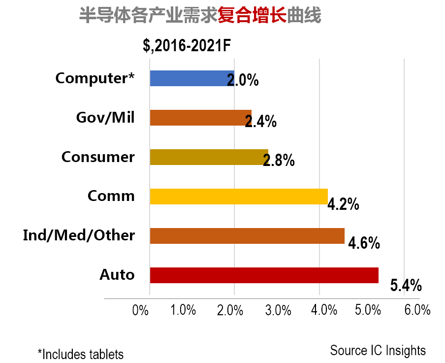 汽車產(chǎn)業(yè)的投資機(jī)會(huì)點(diǎn)可以從數(shù)據(jù)中找到。從應(yīng)用看,安全和電動(dòng)系統(tǒng)兩個(gè)部分的復(fù)合增長率最高,未來5年兩者的復(fù)合增長率分別能夠達(dá)到17%和18%。從器件看,安全需求主要帶動(dòng)傳感器的高速增長,增長率預(yù)計(jì)超過20%;電動(dòng)化主要帶動(dòng)功率器件增長。