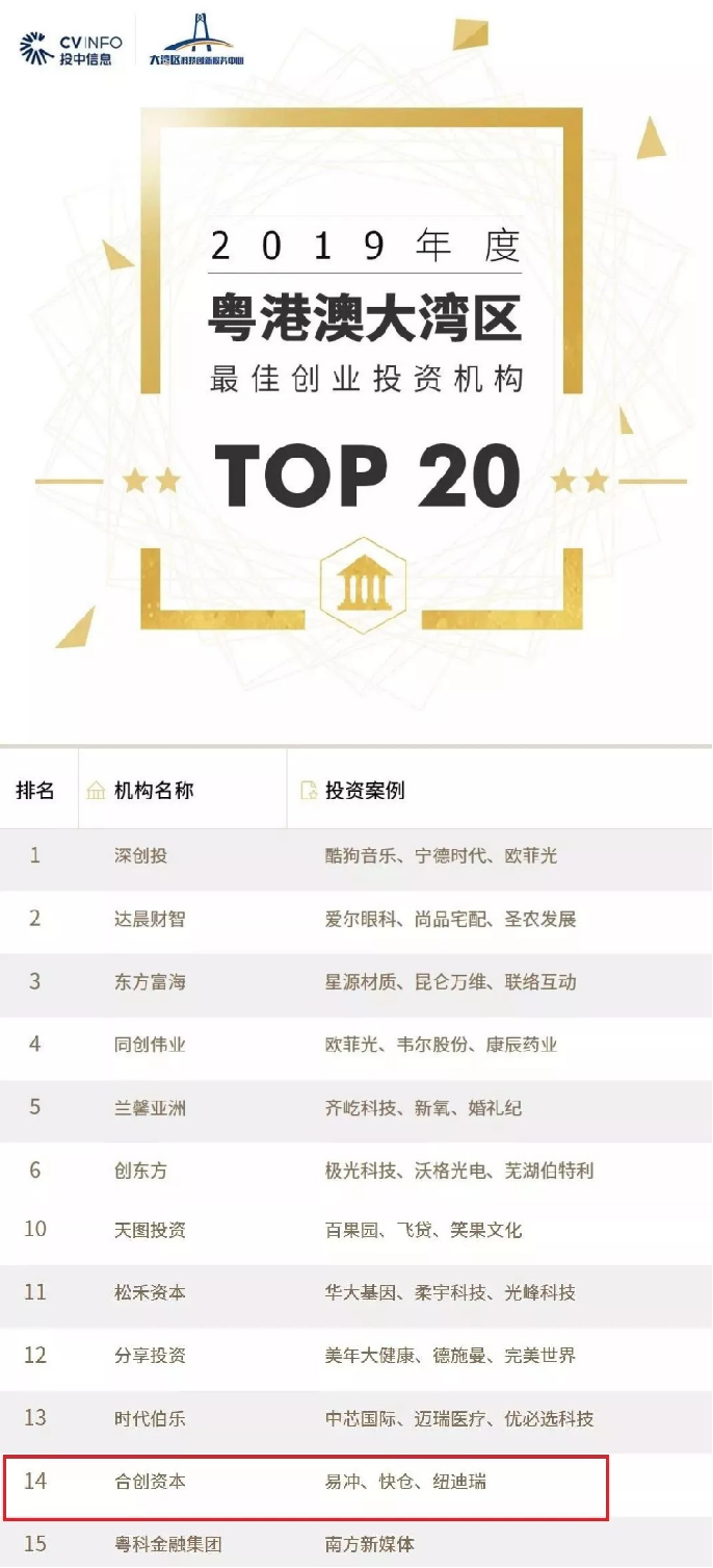 12月18日,投中信息與大灣區(qū)科技創(chuàng)新服務中心聯(lián)合發(fā)布2019年度粵港澳大灣區(qū)榜單。合創(chuàng)資本榮登“2019年度粵港澳大灣區(qū)最佳創(chuàng)業(yè)投資機構TOP20”榜單。