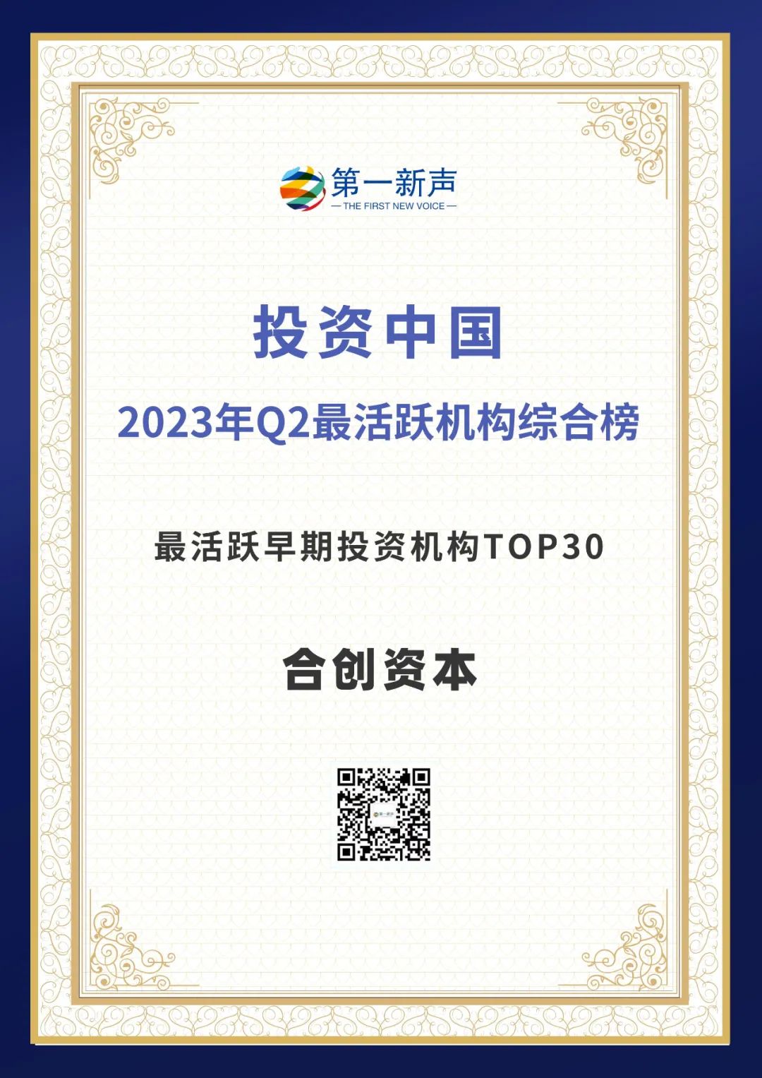 7月31日,第一新聲2023年Q2中國最活躍機(jī)構(gòu)系列榜單發(fā)布,合創(chuàng)資本榮獲Q2“最活躍早期投資機(jī)構(gòu)TOP30”。